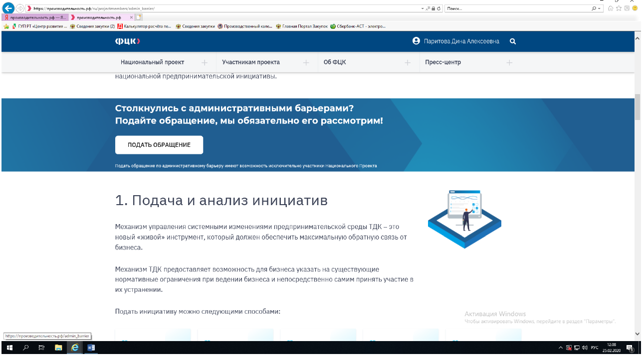 В целях реализации мероприятий национального проекта «Производительность труда и поддержка занятости» (далее – национальный проект) по снижению административных барьеров, влияющих на рост производительности труда и сокращению избыточной регуляторной нагрузки на предприятия Минэкономразвития России повторно информирует о реализации дополнительной возможности подачи обращений по административным барьерам для участников национального проекта в личном кабинете на платформе «производительность.рф» в разделе «Административные барьеры» (скриншоты прилагаются).