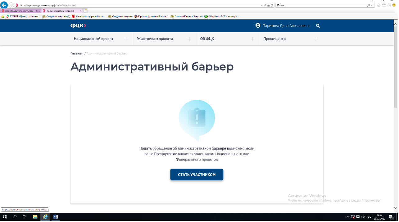 Раздел обеспечивает возможность отправки обращения о наличии административных барьеров, препятствующих росту производительности труда. Процесс приема и обработки обращения об административном барьере состоит из следующих этапов: