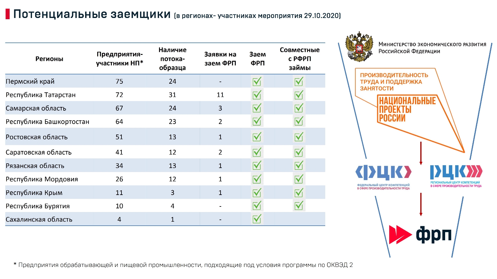 В Минэкономразвития России подвели промежуточные итоги активности предприятий регионов по подаче заявок на получение льготного займа Фонда Развития Промышленности по программе «Повышение производительности труда» - одной из мер поддержки предприятий -участников в рамках Национального проекта «Производительность труда и поддержка занятости».