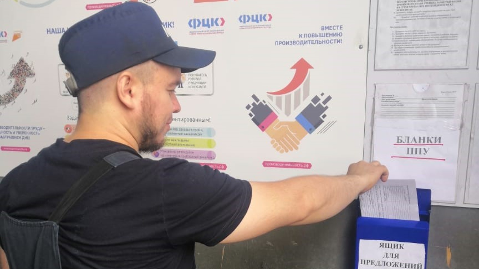 В производстве разместили стенд по работе с ППУ, установили бланки для подачи предложений, ящик для сбора идей от сотрудников, место размещения результатов проведенных, совещаний по рассмотрению предложений, схему процесса подачи и реализации ППУ и место под фото сотрудника, набравшего наибольшее количество баллов за предыдущий месяц.