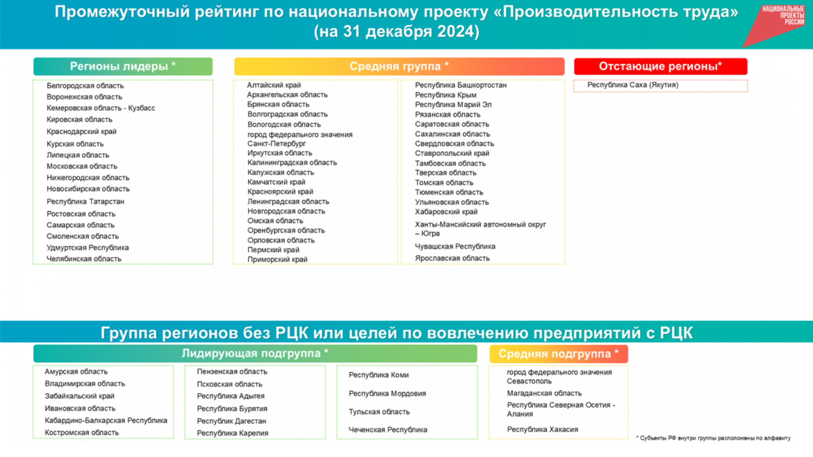 В группе без целей по РЦК – 16 регионов лидеров, 4 в средней подгруппе.